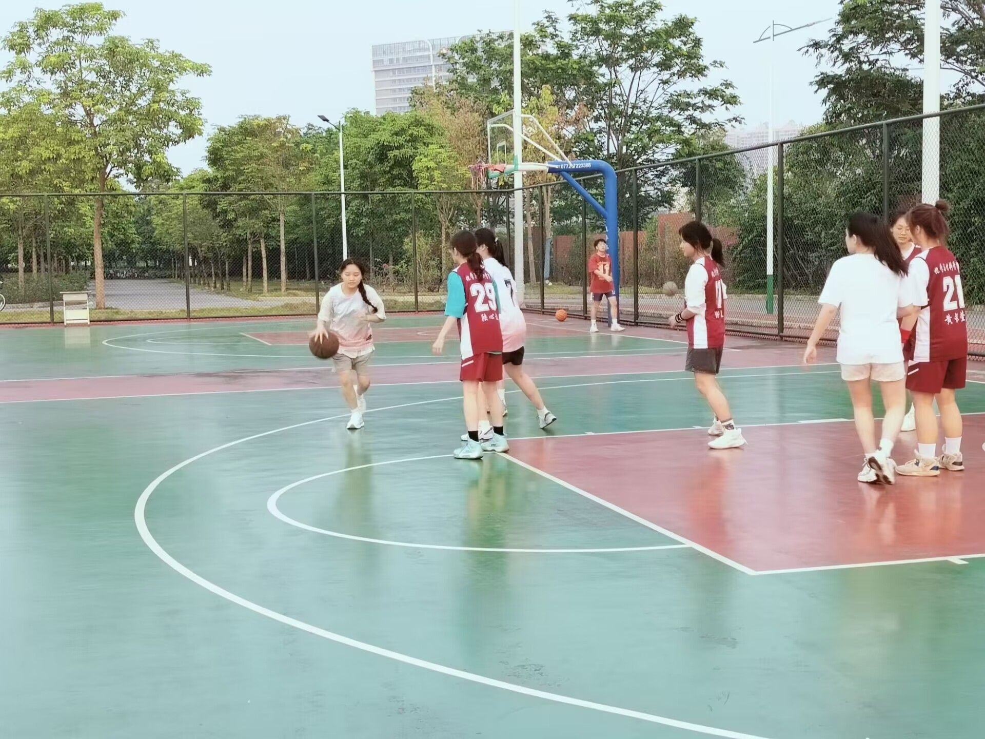 特此举办“烧杯”杯篮球比赛。经过了初赛角逐,23应化2班女子队顺利进入半决赛,4月24日下午,23应化2班女子队与A3组女子队在松园篮球场进行了一场激烈的篮球比赛。全班同学一起为场上的同学加油助威。