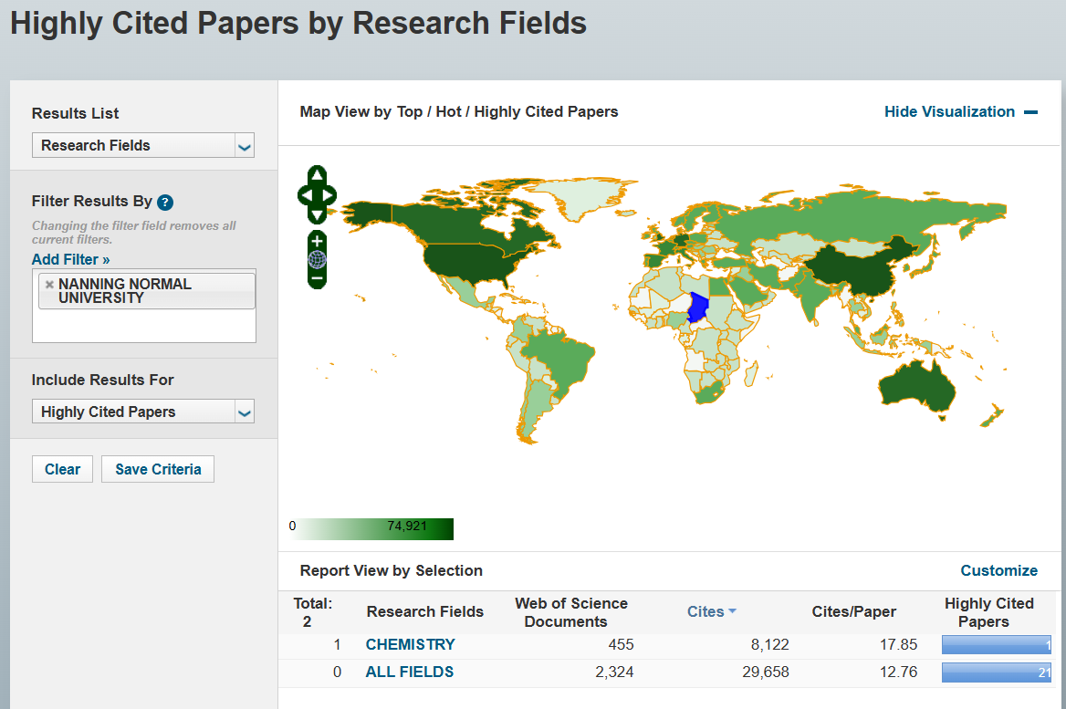 化学学科共发表455篇Web of Science论文,总被引频次8122次,为此次进入ESI全球前1%奠定了坚实基础。