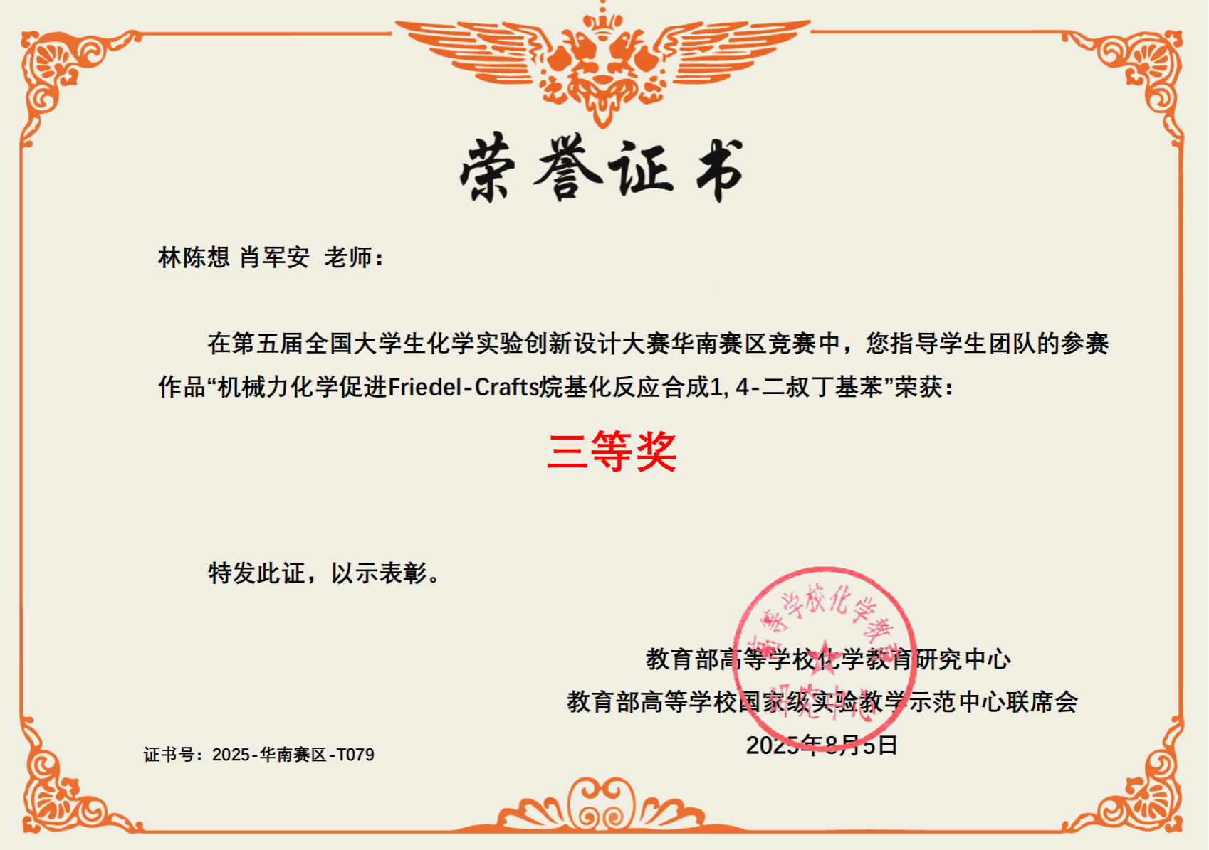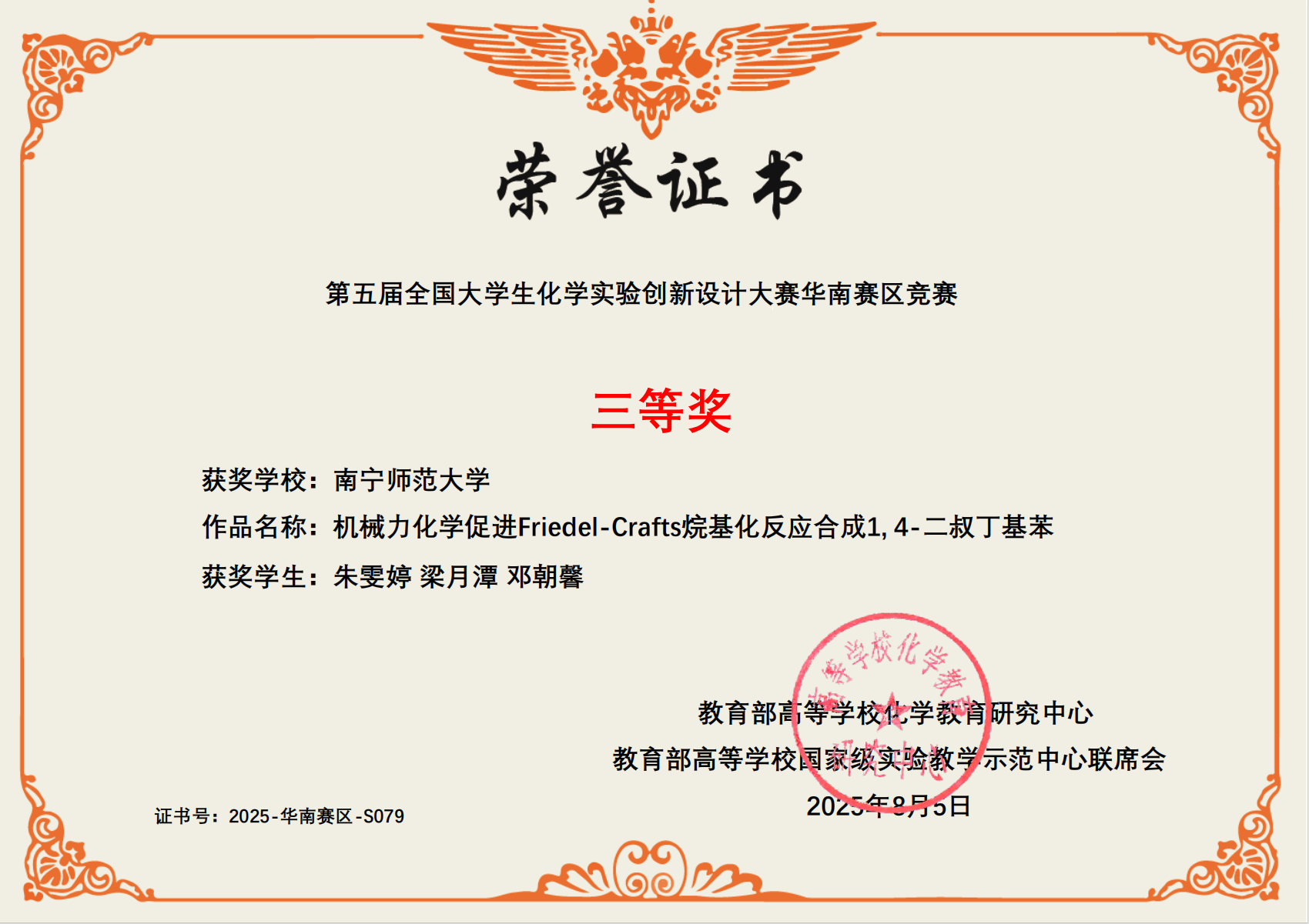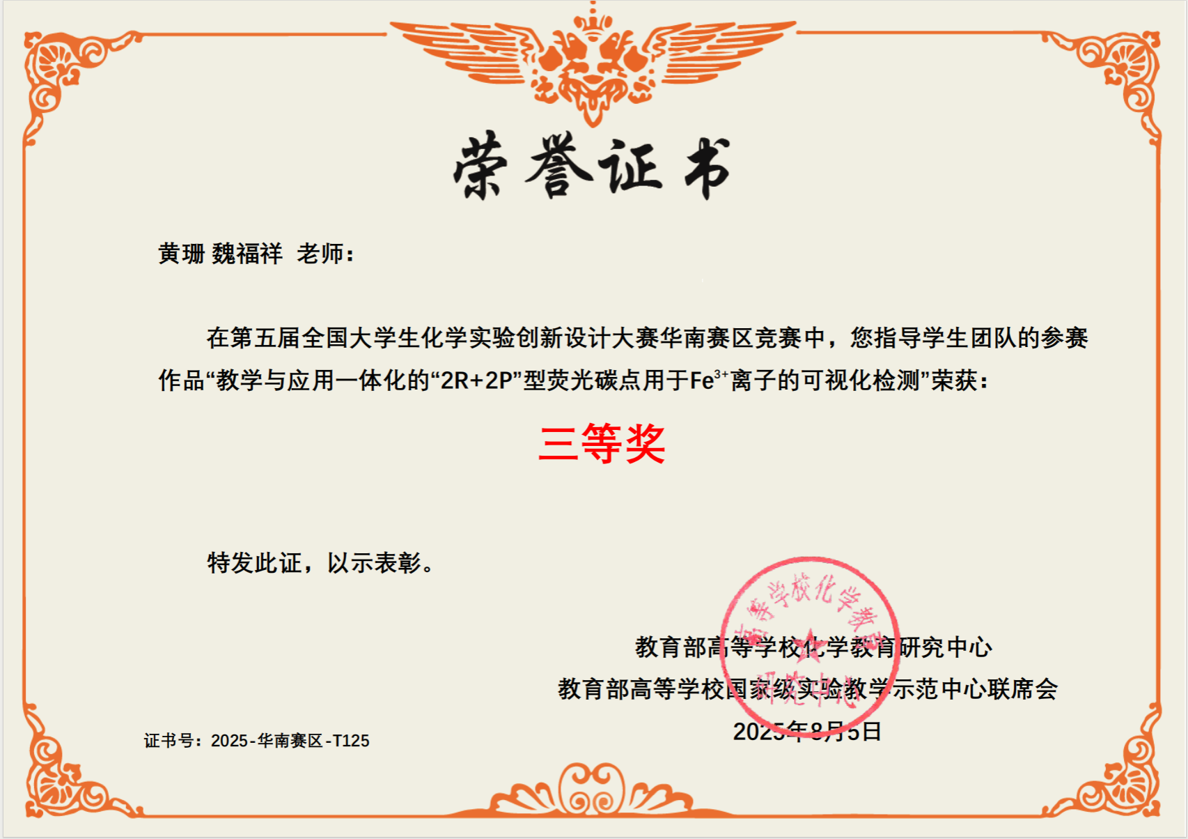 学生张文蓉、夏宗乾、黎芳燕项目《渗透压的神奇力量:半透膜“抽水机”大揭秘》获得二等奖,学生朱雯婷、梁月潭、邓朝馨项目《机械力化学促进Fried-Crafts烷基反应合成1,4-二叔丁基苯》获得三等奖,学生谭子杨、黄馨亿、黄艺丽项目《教学与应用一体化的“2R+2P型荧光碳点用于Fe³⁺”》获得三等奖,莫启进、张丽霞、林陈想、肖军安、黄珊、魏福祥等老师获得优秀指导老师奖。